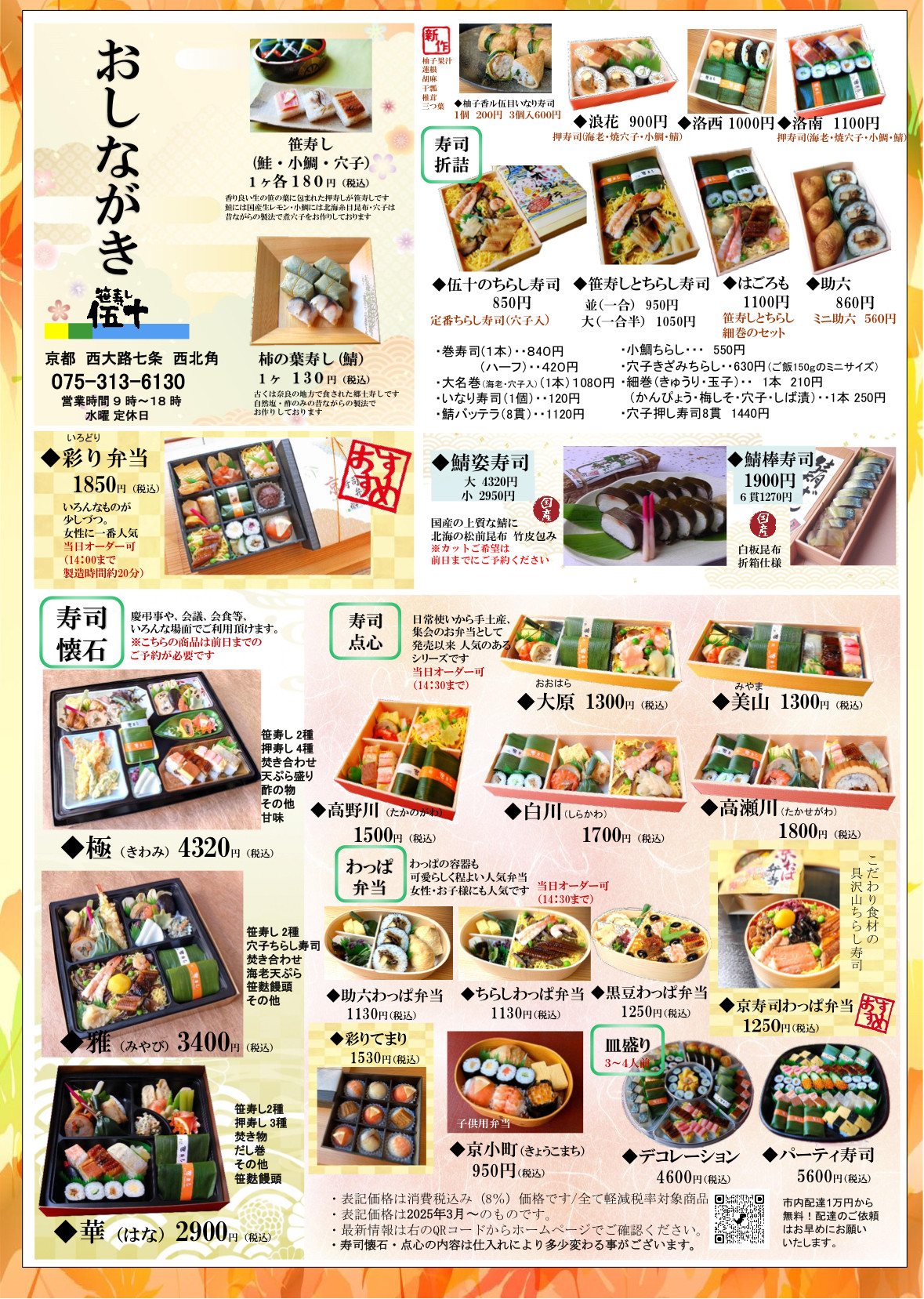 | 設備・サービス | 京都市内 配達しております 【配達料】 ・10,000円までの御買い上げ (指定エリア内 550円) (指定エリア外 1,100円) 詳しくはお問い合わせください。 ・10,000円以上の御買い上げ 京都市内(一部除く)無料 配達は即日は都合の付かない場合がございます。御早めにお電話でのご予約をお願いいたします。 |